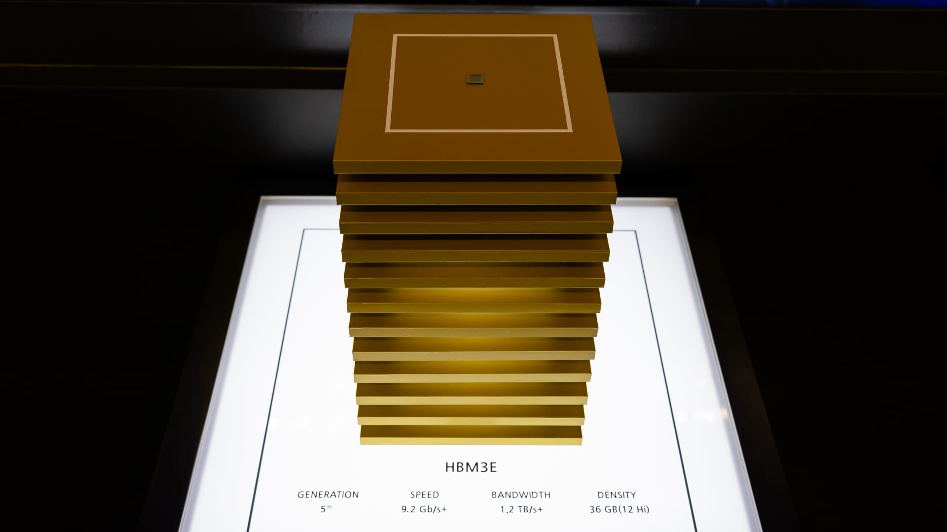 A SK Hynix Inc. 12-layer HBM3E memory chip displayed at the Semiconductor Exhibition in Seoul, South Korea.