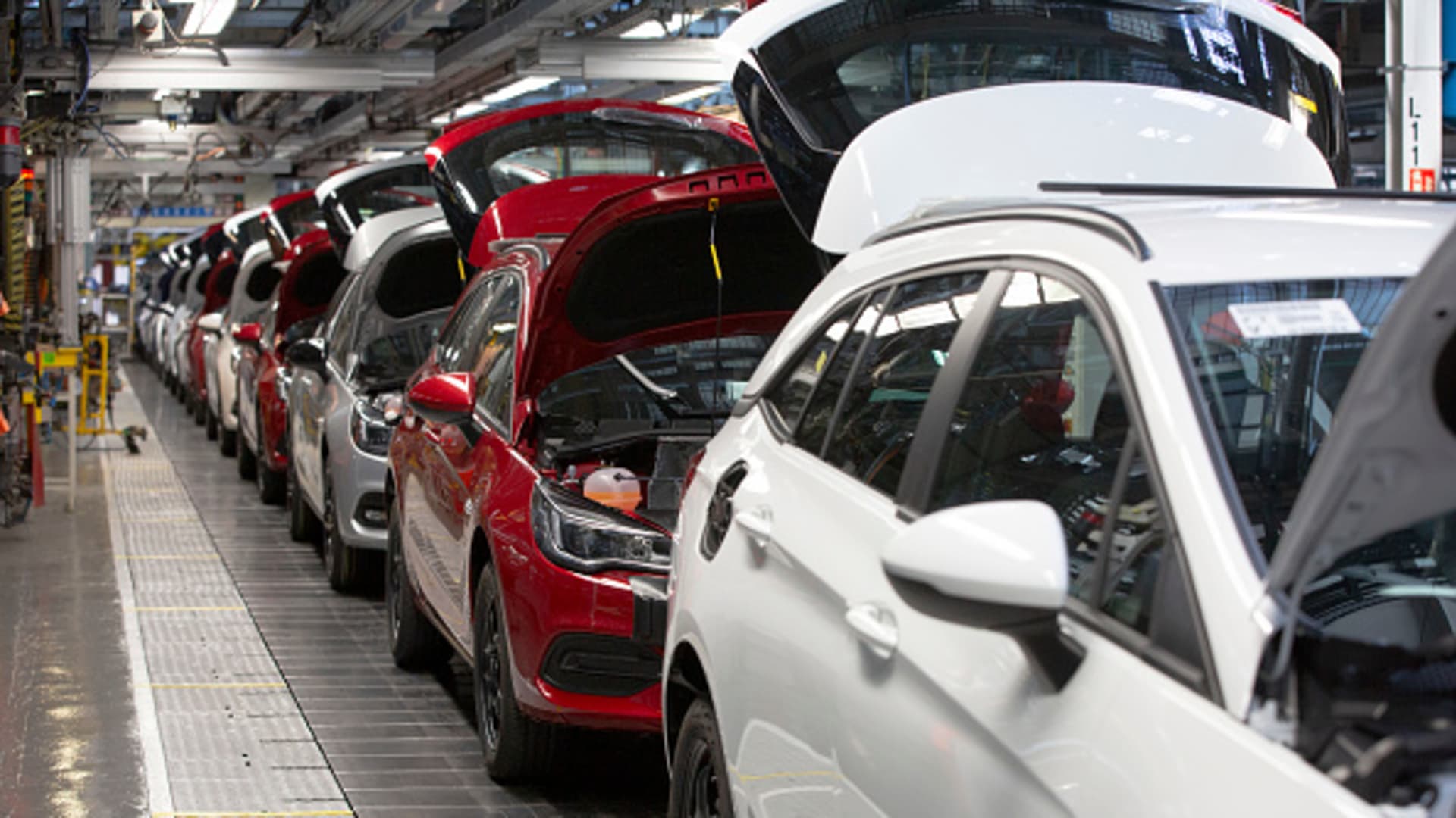 A line of cars on a car assembly line at the Vauxhall car factory in Ellesmere Port, Wirral, U.K.