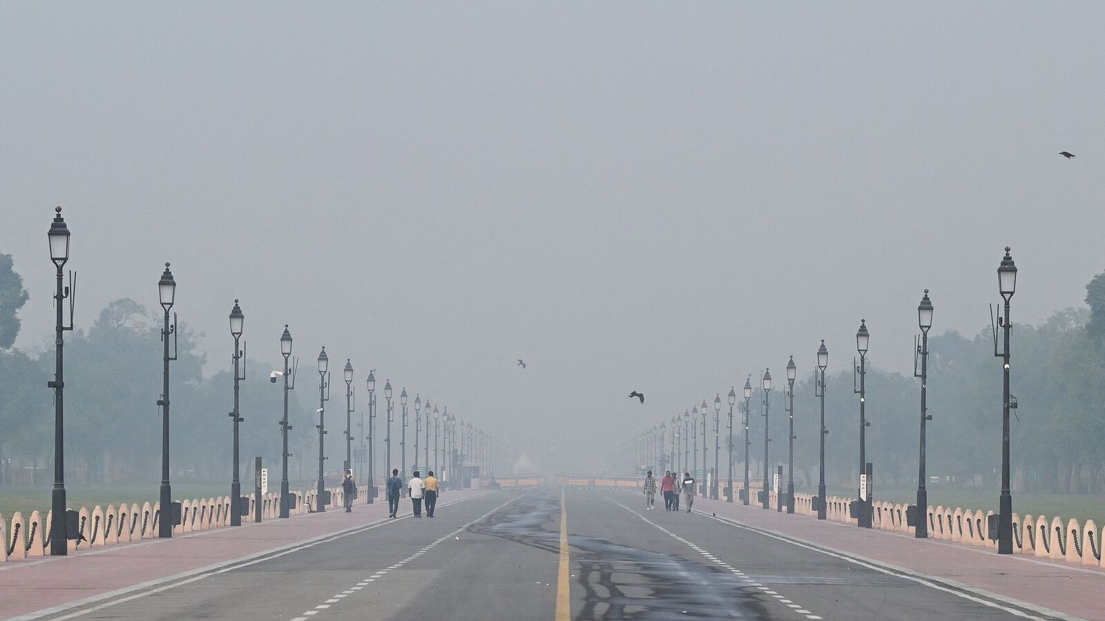 Delhi AQI: Pedestrians walk along the Kartavya Path near India Gate as thick smog engulfs the city skyline in New Delhi on October 22, 2025.