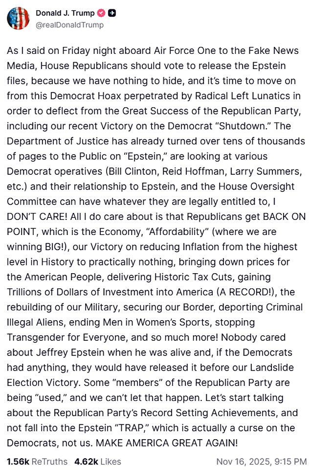 ‘Some ‘members’ of the Republican Party are being ‘used,’ and we can’t let that happen. Let’s start talking about the Republican Party’s Record Setting Achievements, and not fall into the Epstein ‘TRAP,’ which is actually a curse on the Democrats, not us. MAKE AMERICA GREAT AGAIN!’