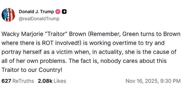 ‘Wacky Marjorie ‘Traitor’ Brown (Remember, Green turns to Brown where there is ROT involved!) is working overtime to try and portray herself as a victim when, in actuality, she is the cause of all of her own problems. The fact is, nobody cares about this Traitor to our Country!’