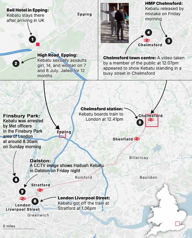 After Kebatu was released, the convicted sex offender is understood to have returned to prison but was repeatedly turned away by guards who instead directed him to Chelmsford train station.
