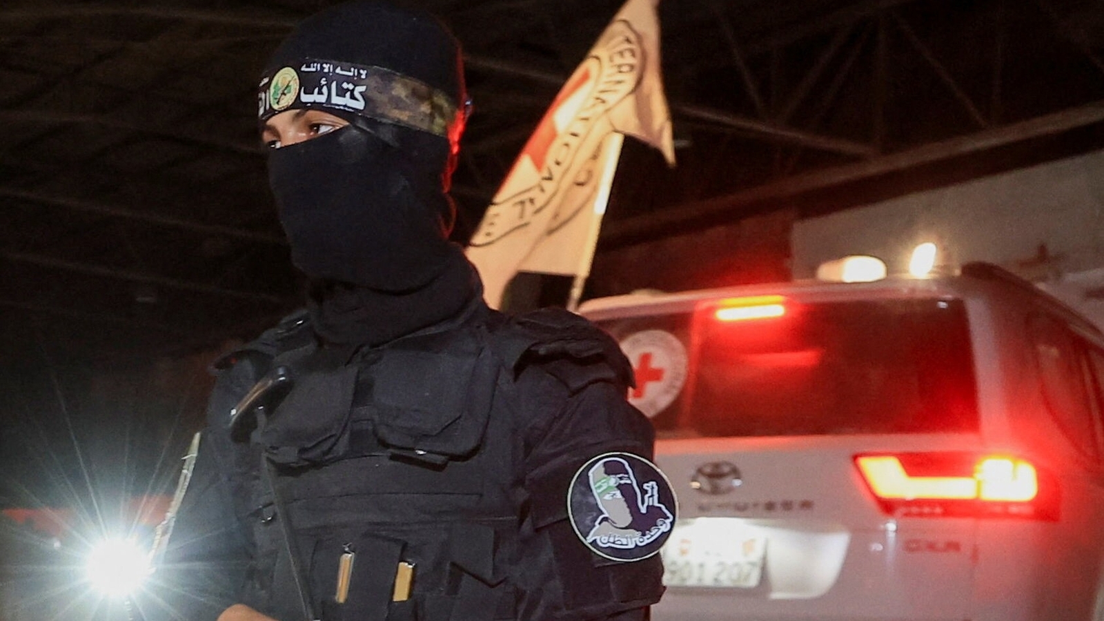 An armed Hamas militant stands guard as a Red Cross vehicle arrives to receive from Hamas militants the bodies of deceased hostages who had been held in Gaza(REUTERS)