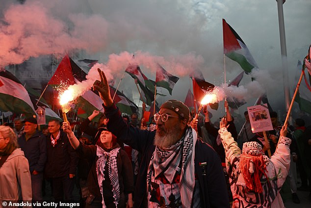 Earlier, Palestine flags were dotted across the stands after hundreds of fans marched to the stadium in protest against Israel.