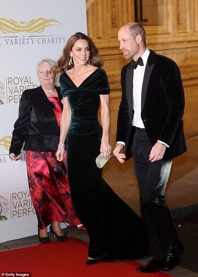 William and Catherine arrived outside the main entrance to the building, the Princess looking elegant in a full-length green velvet evening gown. The Prince was dapper in black tie.