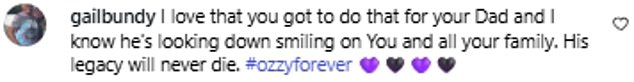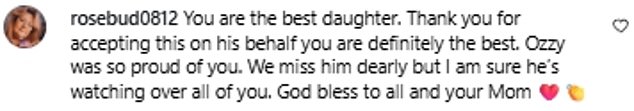 ‘You are the best daughter. Thank you for accepting this on his behalf, you are definitely the best. Ozzy was so proud of you. We miss him dearly but I am sure he’s watching over all of you. God bless to all and your mum.’
