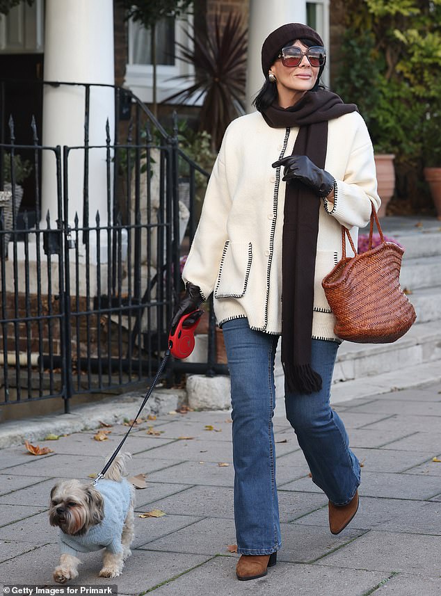 The former EastEnders star, 49, looked effortlessly chic in a white Primark cardigan which featured a stylish black knit trim while out with her pet dog in East Molesey.