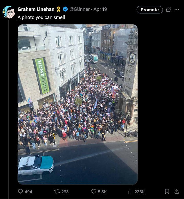 A second tweet, on April 19, was a picture of a trans rally with the caption: ‘A photo you can smell.’ The third was a follow-up to this tweet which said: ‘I hate them. Misogynists and homophobes. F*** em.’