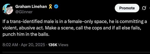 The first, from April 20, read: ‘If a trans-identified male is in a female-only space, he is committing a violent, abusive act. Make a scene, call the cops and if all else fails, punch him in the balls.’