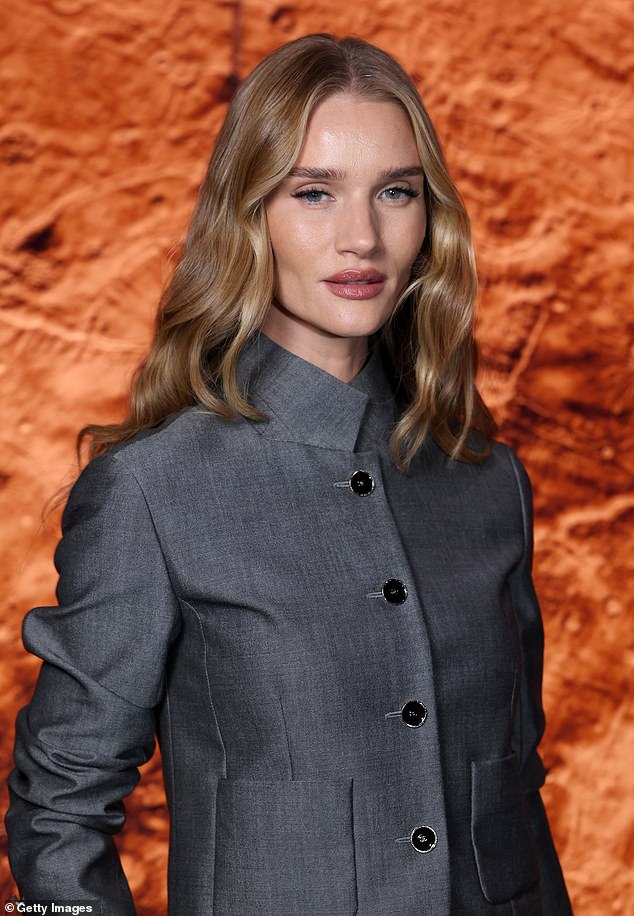 Rosie Huntington-Whiteley opted for a chic grey jacket