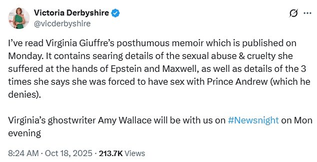 ‘One of the things the out of court settlement with Prince Andrew did was mean that the world never got to hear her testimony and now in this book we will hear that and it has clearly spooked the Royal Family and that is really symbolic because of how vigorously they have denied these allegations and it is a symbol that there are things in that book that they find very, very worrying.