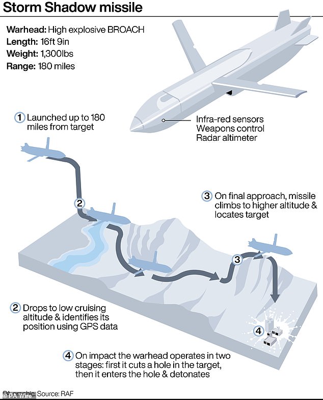 Storm Shadow missiles have a range of between 155-349 miles and are equipped with advanced navigation systems to strike critical targets.